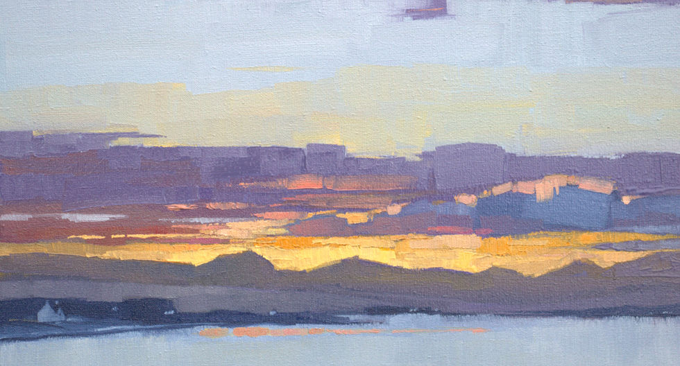 Gently rolling hills and hedged fields cover large swathes of Scotland. Subtle shifts in warmth and tone feature on canvases that frequently become semi-abstract.